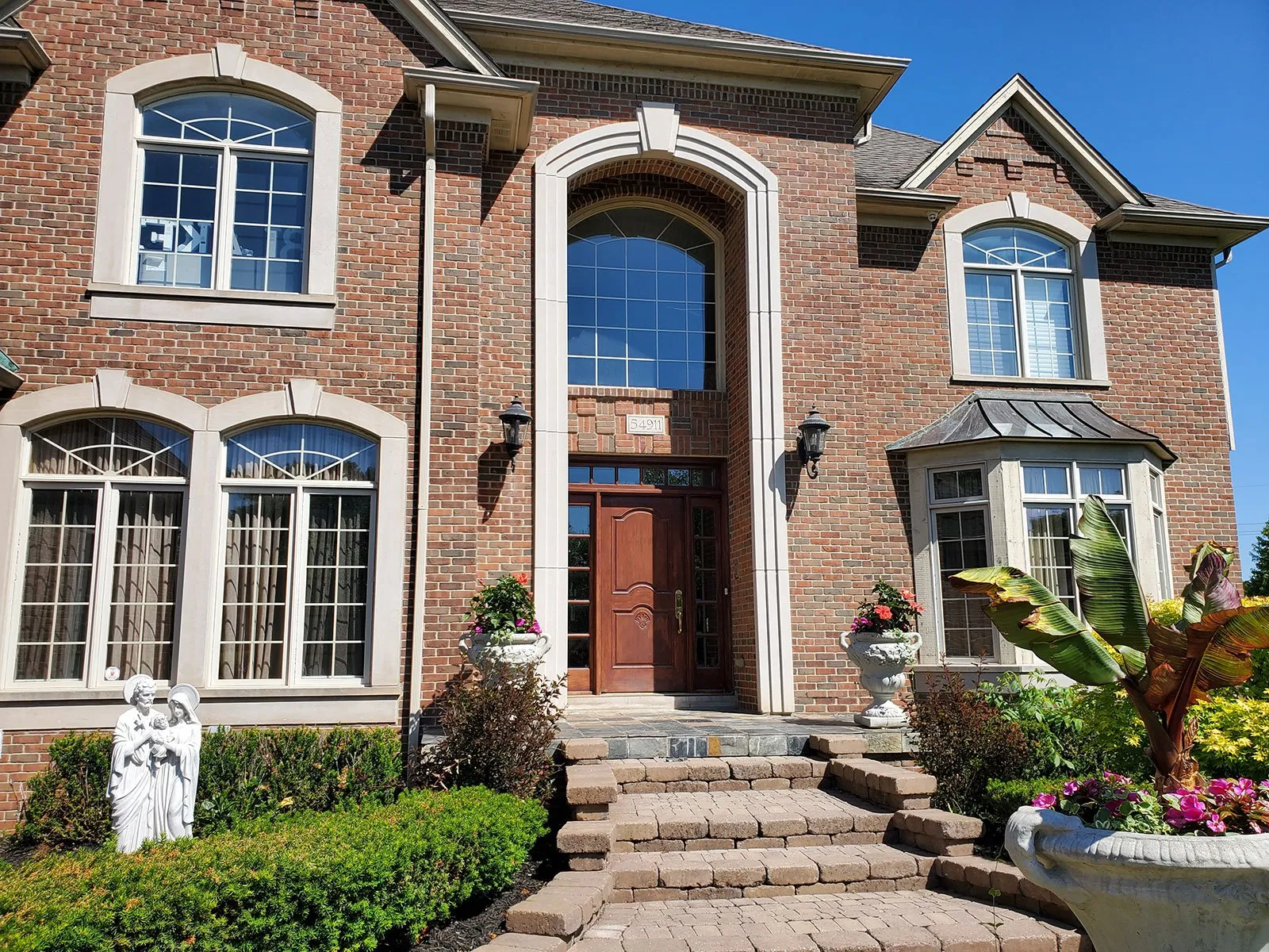 We designed a tiered entry system using wide stone steps, structured retaining walls, and clean paving lines that naturally guide movement toward the front door. Symmetrical planting beds and crisp lawn edges frame the architecture while reinforcing balance and order.