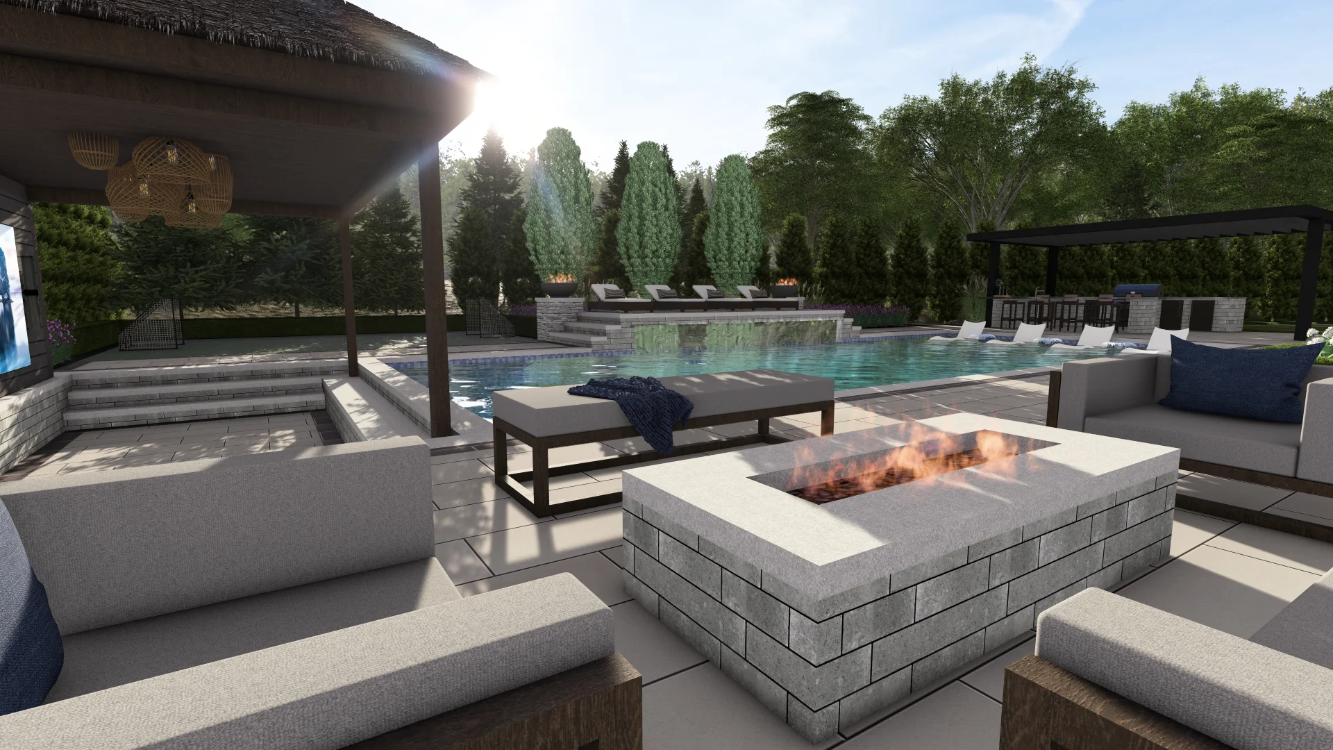 Pool with spa, fire pit, Poolside Grill and bar, Pergola, Entertainment tiki lounge, putting green with flex space